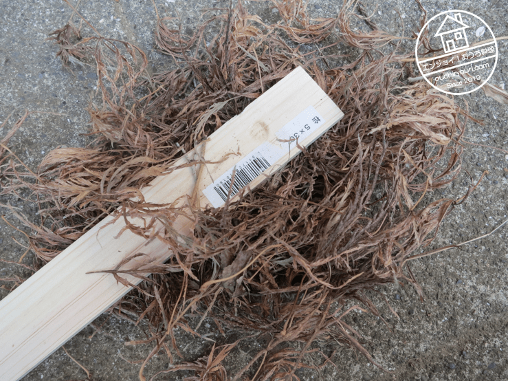 庭で拾った枯葉と、ホームセンターで購入した木材(桧、ひのき)です。枯葉は室内の日当たりの良い場所で1日乾かしました。サバイバルではこんな整った状況はないですが、難易度を下げるために準備しました。