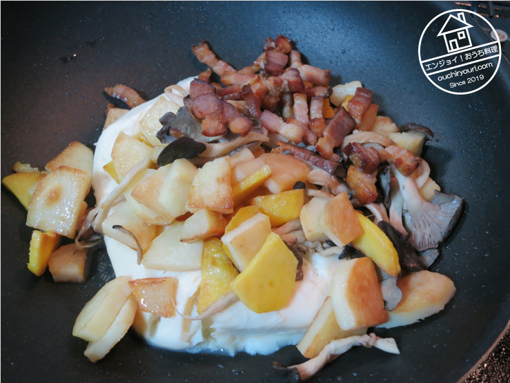 冷凍保存しておいたホワイトソース、炒めたジャガイモとキノコ、脂抜きしたベーコンを混ぜ、塩胡椒で調味します。ホワイトソースの原料の牛乳は既に塩分を持っているので、塩加減には要注意です。