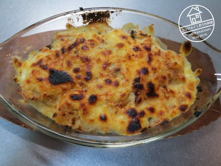 耐熱皿に盛り、溶けるチーズをかけて、魚焼きグリルで焦げ目をつけたら完成です。