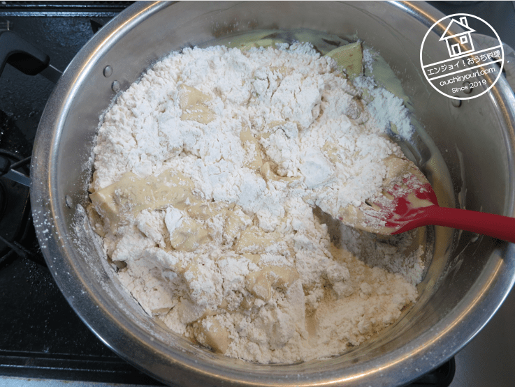 小麦粉(薄力粉)を篩い入れ混ぜます。この場面でも口の広い大鍋は便利です。