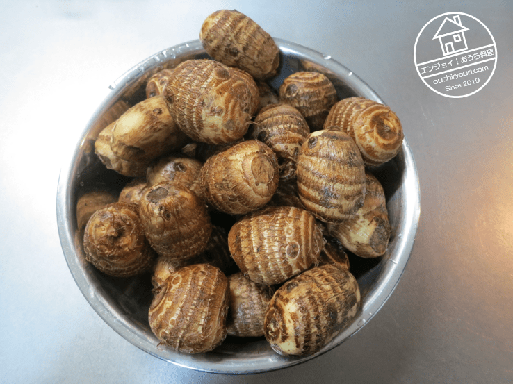 小ぶりの里芋です。たわしで洗って泥を落としました。小ぶりの里芋は洗浄や皮むきが面倒なので、できれば大ぶりなのを買った方が良いです。大ぶりなのはちょっと値段が高いですが。