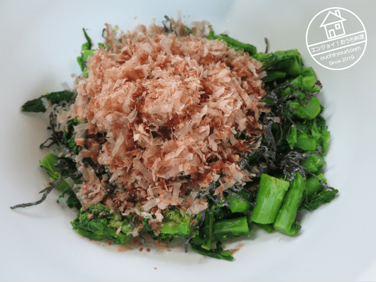 菜の花は水を適度に絞り、食べやすいように切ります。塩昆布と鰹節を加え、醤油で味付けして和えたら完成です。おひたしにして塩昆布と和える方法は菜の花の包み紙に書かれていました。