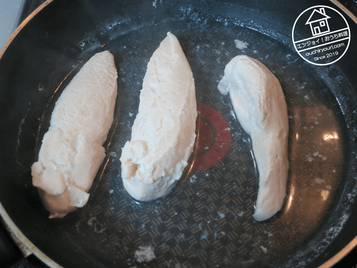 万一ですがササミの加熱が不十分だと怖いので、念のため少量の水で茹でて予め火を通しておきました。茹で汁はダシ汁として使います。