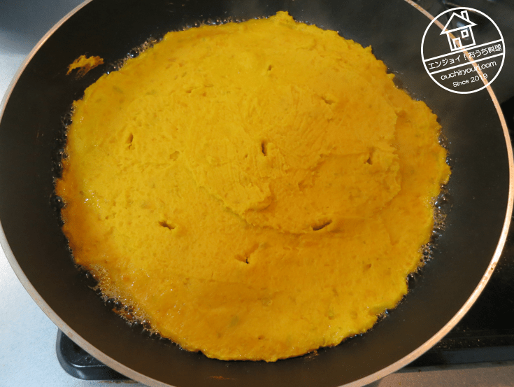 フライパンに伸ばし、周囲からオリーブオイルを流し込み焼きました。焼くと中央が膨れて浮いてしまったので、箸で穴をあけてガス抜きして平らに戻しました。
