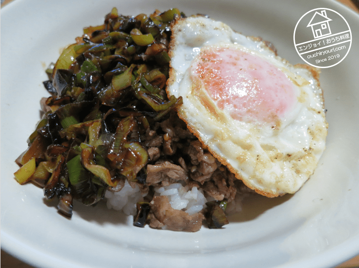 焼きネギと目玉焼きを乗せたら完成です。醤油とキムチの素をかけて食べます。