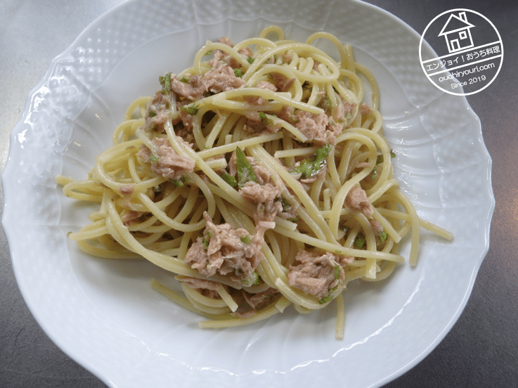 茹でたスパゲッティーをツナと蕗のとうで和えたら完成です。