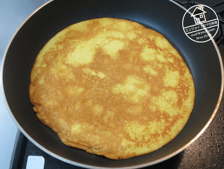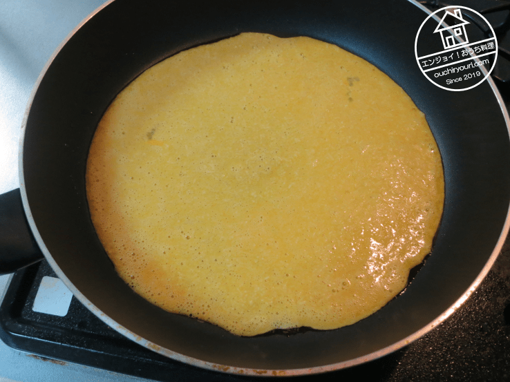 油をひいたフライパンに薄く延ばして焼きます。オムレツ型にすると中がどろっとして気持ち悪くなりそうだったので薄焼きにしました。