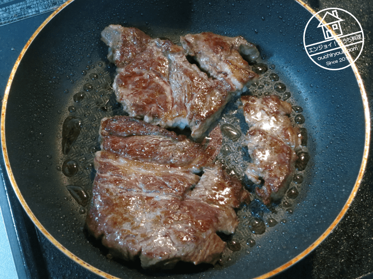 ②先ずは両面をさっと焼く。そしてちょこちょこ返しながら両面から火を入れる。肉は焼くと縮みます。そのため片面ばかり焼くと湾曲してしまいフライパンの面に当たらなくてうまく焼けなくなります。それを防ぐために両面から火を入れます。