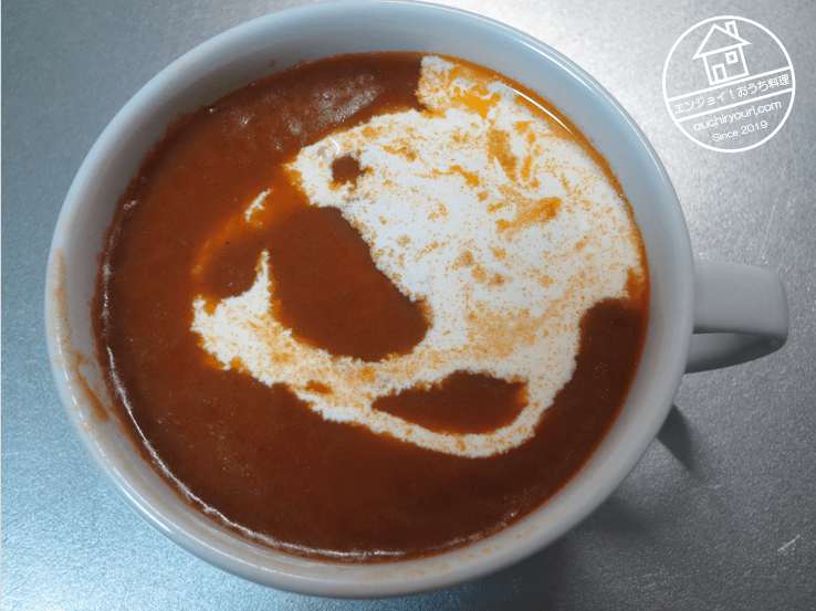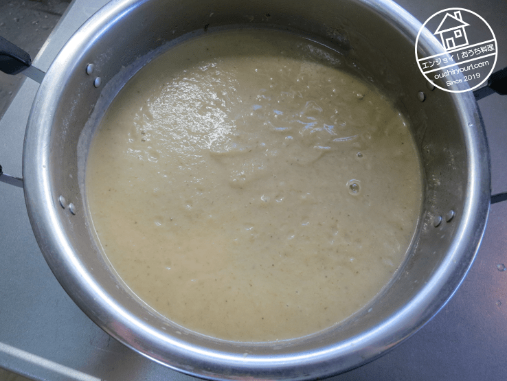 煮込んだ野菜をバーミックスで粉砕し、ペースト状にしました。バーミックスとかミキサーにかければ食材は砕けてペースト状にはなりますが、繊維は長いまま残ることがあります。野菜ペーストを作るなら、事前に包丁で野菜を出来るだけ薄くスライスして繊維を短く断っておいた方がよいです。