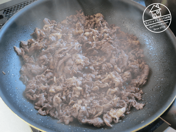 牛肉切り落とし600gを炒め、赤ワイン200ccを加えて煮詰め、アルコールを飛ばします。