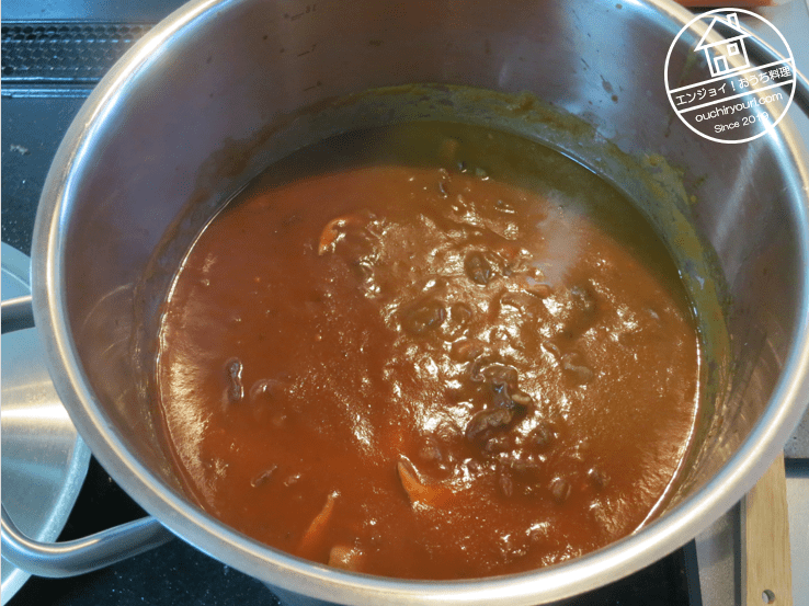 炒めた具に水を加え、1時間煮ました。煮る前に炒めたのは嵩減らしと、その方が軟らかくなるためです。
