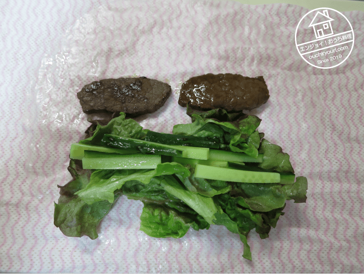 牛モモ肉を焼いて、焼き肉のタレをつけたものを包みます。
