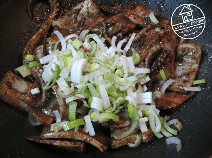 肝とスミを潰して加えます。醤油と酒を加えて炒め、イカに火が通ったら長ネギを加えて、さっと炒めて完成です。