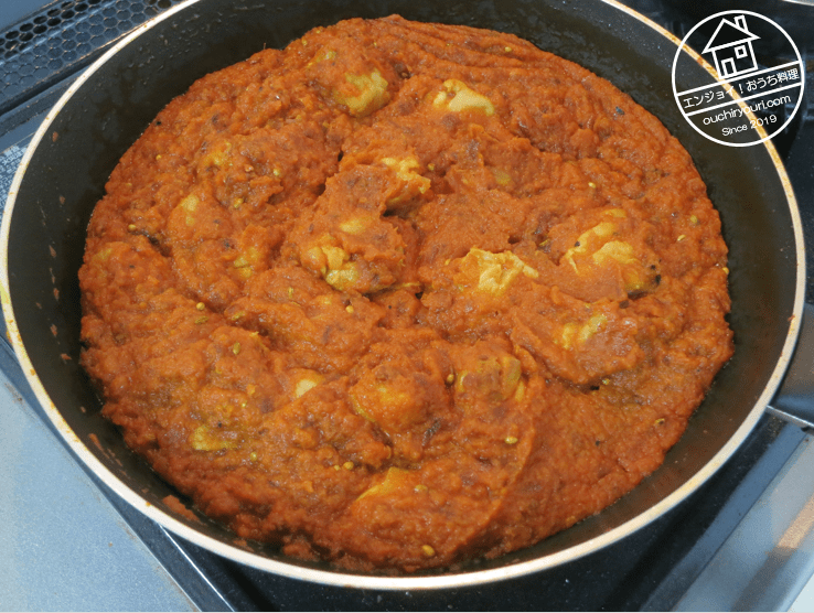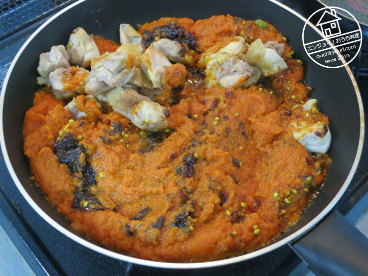 野菜ペーストにテンパリングしたスパイス油、飴玉ニンニク、予め炒めておいた鶏モモ肉を加えました。