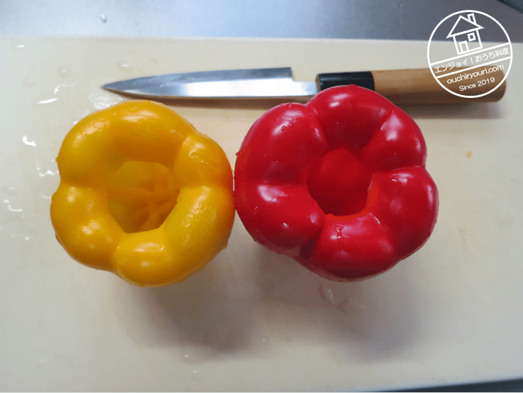 番組ではトマトでしたが、今回は冷蔵庫にあったパプリカを使ってみます。パプリカは具を沢山詰められるよう大きなものが良いです。また、盛り付け時に立たせられるよう、お尻の形がよいものがよいです。上の二つでしたら、赤の方がベターです。