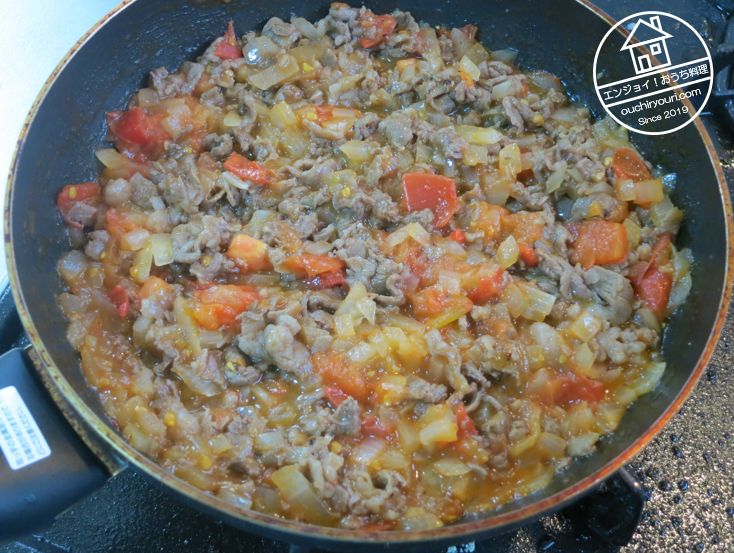 玉ねぎを透き通るまで炒め、生トマトを加え、トマトを煮溶かします。次いで解凍した素炒め牛肉を細かく切って加えます。塩と白ワインで調味します。最後に香りづけとしてクミン、黒コショウ、バジル、オレガノを加えました。オレガノを加えると一気にギリシャっぽい香りになります。