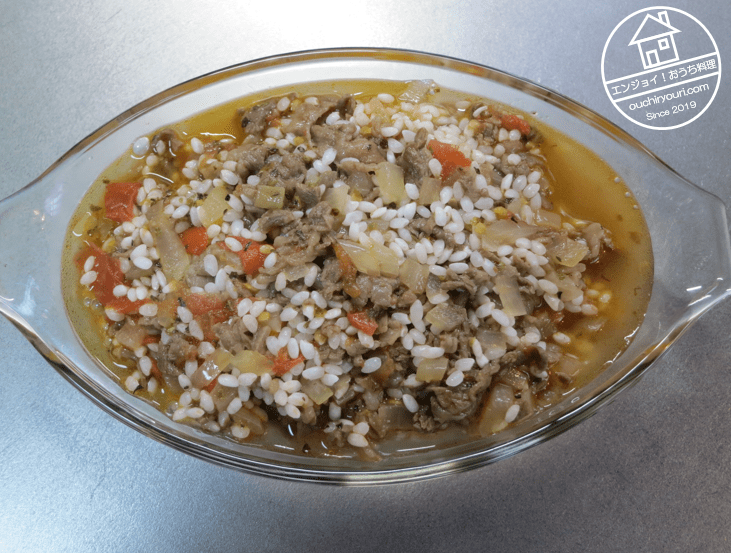 余った米はグラタン皿で炊くことにしました。こちらも水を加え、アルミホイルで覆います。