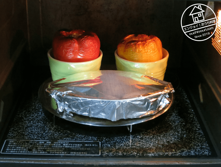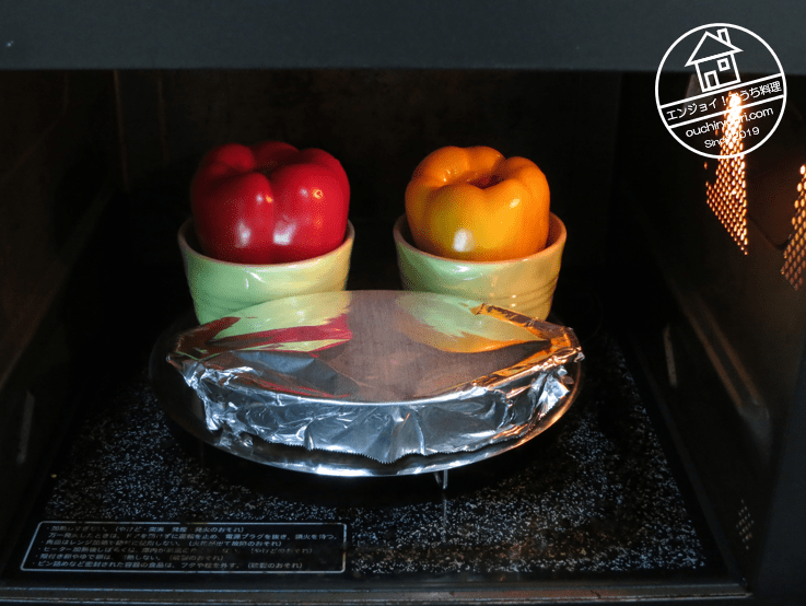 パプリカに米を詰め、水を注ぎます。パプリカはココット(耐熱性の小鉢)に立てるとよいです。