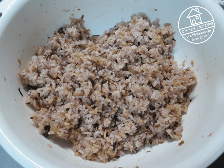 釜がいっぱいで混ぜにくいので、半分をボウルにとりました。