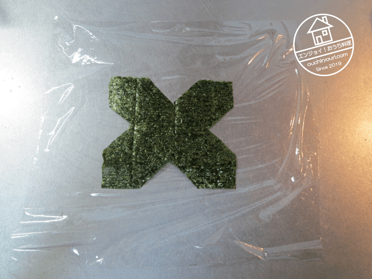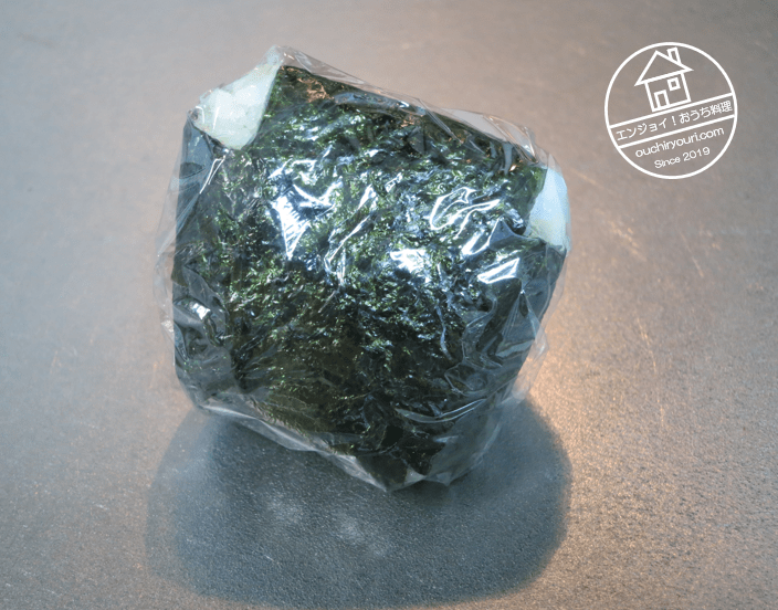 同じく衛生のため、なるべく直に触らないようにして包みます。海苔が変な形をしていますが、この形にすると包みやすいことを発見しました。切れ端は中に入れます。海苔は栄養豊富なので、きっと子供の成長にとって良い効果があると思います。