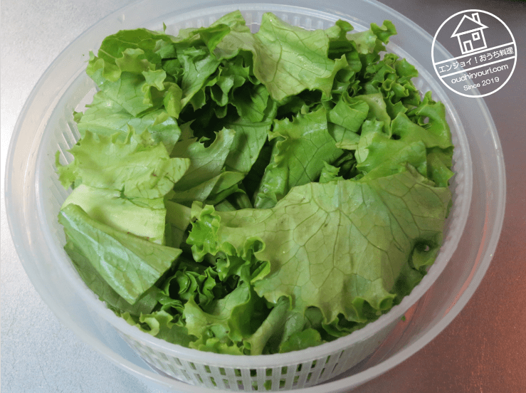 レタス(グリーンカール)は水洗いして、回転水切り器で水をきります。