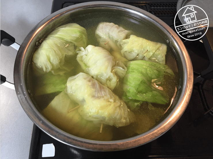 熱湯を注ぎ、コンソメの素と塩で調味し、1時間程煮込みました。まさにあのロールキャベツの香りがして、成功を予感します。