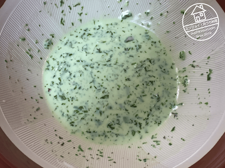 バーブにオリーブオイル、塩、寿司酢、ヨーグルトを加えてすり潰しました。ニンニクを加えても良いと思います。