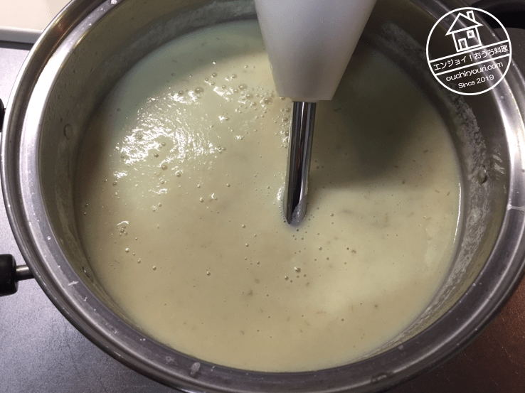 牛乳を加えてバーミックスで粉砕しました。生クリームも加えた方がベターですが、今回は冷蔵庫になかったので牛乳だけです。コンソメの素、塩、砂糖、味の素、バター、黒胡椒で調味して完成としました。生クリームの持つ脂肪分と甘みを他のもので補いました。