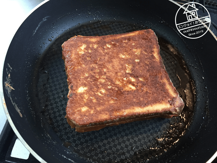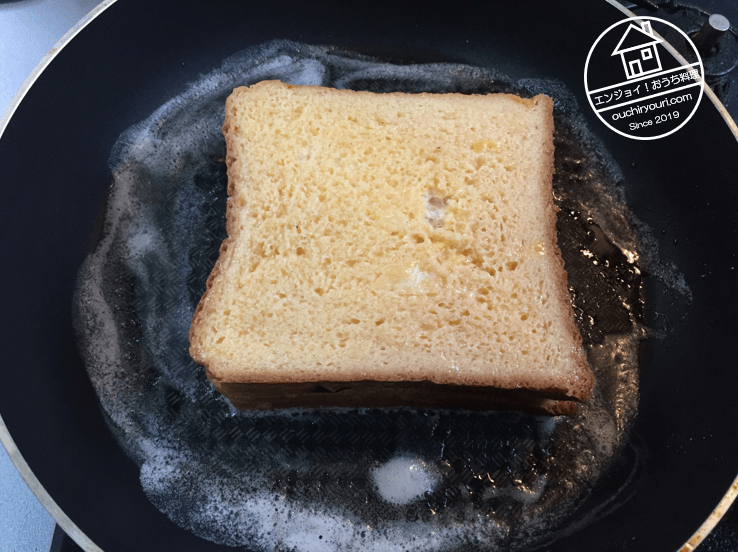 バターをひいたフライパンにパンを乗せ、具を乗せ、卵液に浸したパンをもう一枚乗せて焼きます。各パンについて両面を焼いても良いと思います。
