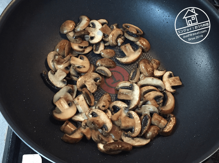 マッシュルームを炒めます。洋食屋のカレーにマッシュルームというか、具はありませんでしたが、入れても悪くないだろうと思いました。