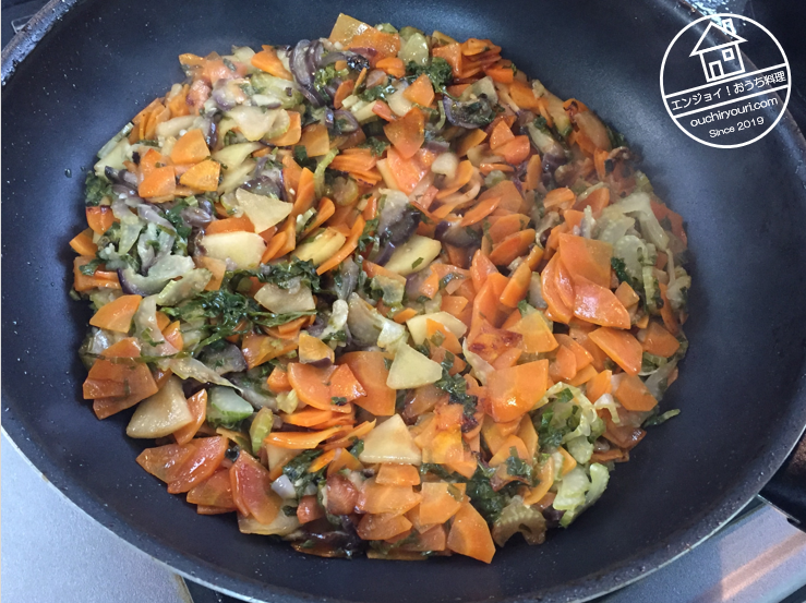 脇役野菜(セロリ、ニンジン、茄子、リンゴ)です。茄子以外はデミグラスソースに使われています。脇役野菜には栄養バランスを向上させ、味わいを豊かにする効果があります。スライスして塩をして炒め、嵩減らしをするとともに青臭さを飛ばします。