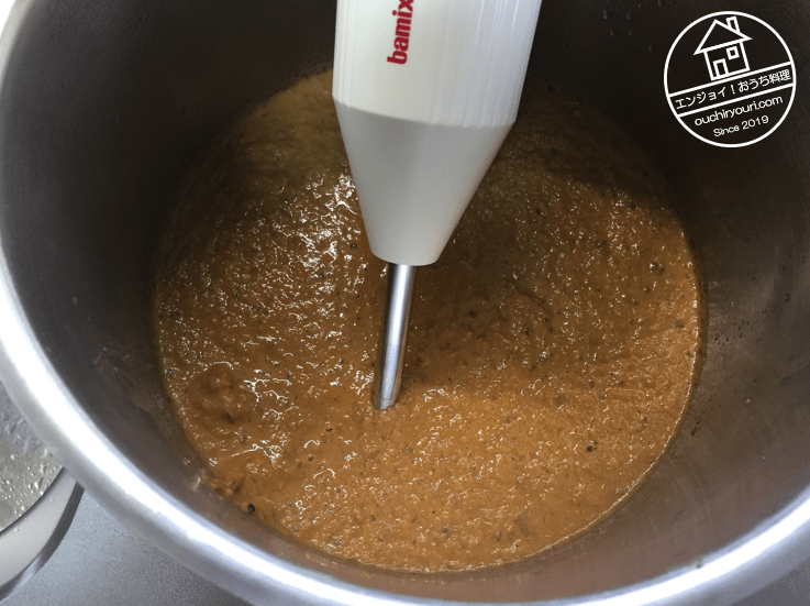 寸胴に主役の玉ねぎペースト、脇役野菜、牛スープを加え、バーミックスで粉砕します。塩を適量加え調味しました。これはこれで美味しかったのですが、主役の玉ねぎペーストにあったあの深い色合いとエッジの効いた味が消えてしまいました・・・。