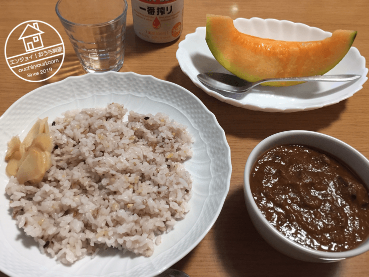 さて、ではいただきますか。ご飯に添えてあるのは実家から貰った生姜の甘酢漬けです。デザートはふるさと納税で貰った夕張メロンです。