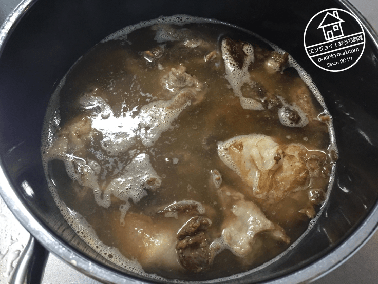 一般的に肉を煮込むには硬水が良いとされています。以前に試してみたところ、硬水は肉のアクを浮き上がらせてくれたり、骨臭さを抑えてくれるように感じました。獣骨を煮込むには硬水が良いと思います。しかしながら今回のようなアクのあまり出ない良質の肉であれば普通の水道水で問題なかったのではないかと思います。