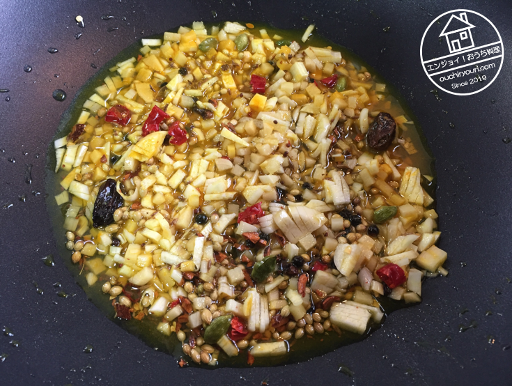 カレーソースを作っていきます。先ずはスパイスをテンパリングします。今回使ったスパイスは、「唐辛子、にんにく、しょうが、シナモン、グリーンカルダモン、ブラウンカルダモン(初!)、クミン、マスタードシード、コリアンダー、ターメリック、黒胡椒」です。左右に2つ見えるやや大きい黒い粒がブラウンカルダモンです。