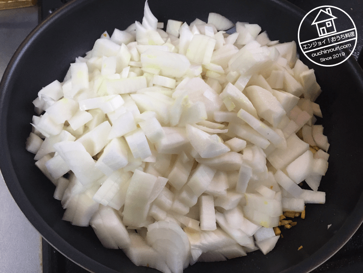 実家から貰った巨大新玉ねぎ2個分です。重量では約1.5kgです。これをスパイス油に加え、塩を少しして飴色に炒めあげます。
