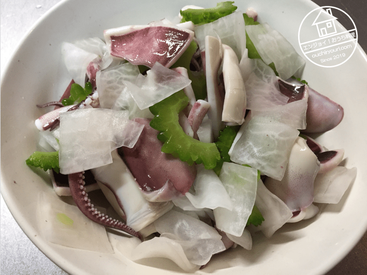 旬のスルメイカと家庭菜園で収穫できたゴーヤを使ってサラダを作りました。
