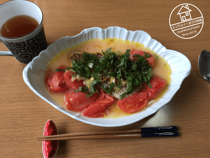 ふむ。塩が全然足りないな・・・。塩を加えたら美味しくいただけました。トマト、魚、大葉の相性は抜群です。