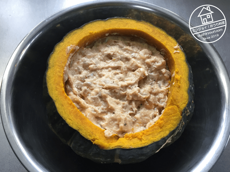 チーズが入る余地を残してグラタンクリームをカボチャに詰めます。