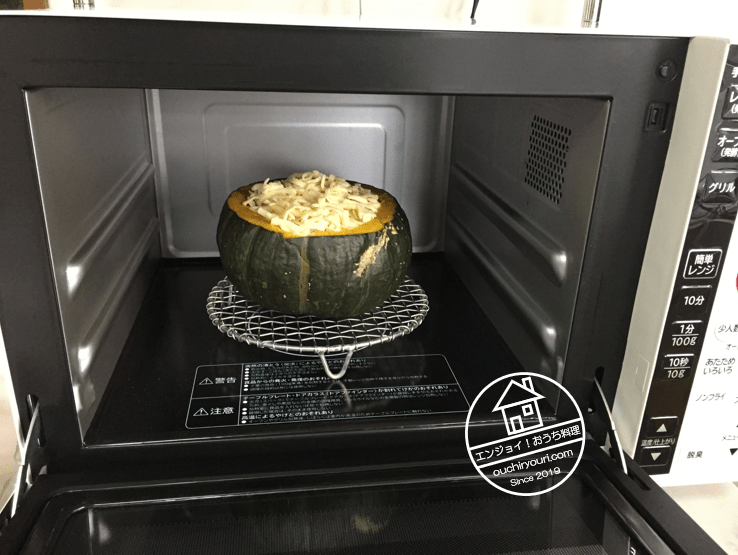 カボチャは密閉容器なので、そのまま長時間加熱を続けると爆発する恐れがあると思います。長時間加熱する場合はガス抜きの穴を開けた方が良いと思います。今回は15分の時点でヘタの周囲にガス穴を開けました。(ガス穴を開けられるくらいに柔らかくなったらこの処理は終了で良かったと思います。)