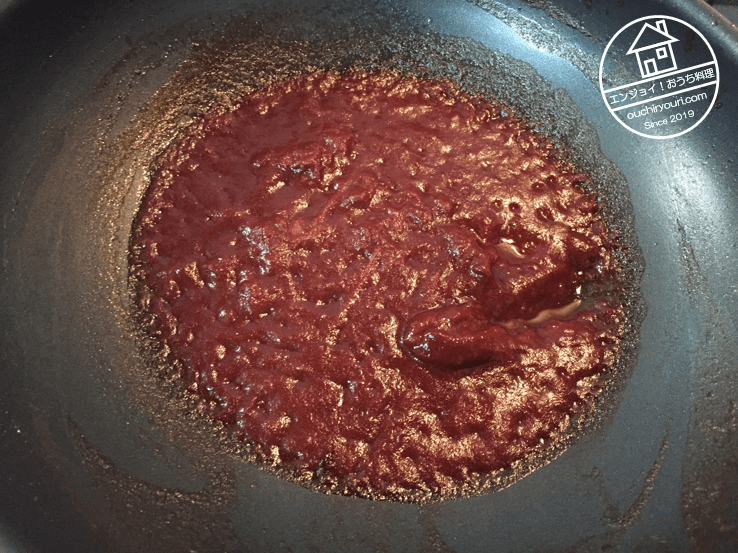 まず、デミグラスソース缶(ハインツ、特選)はそのままでは美味しくないので味の調整をします。トマトを煮崩して煮詰めます。