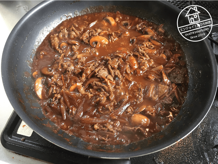 赤ワイン300ccを加えてまた煮詰めます。ここへデミグラスソース缶を加えて混ぜ合わせます。今回は加えませんでしたが、ここへケチャップを加えると味がまとまってベターだと思います。また、バターを加えるとコクが出て良いと思います。