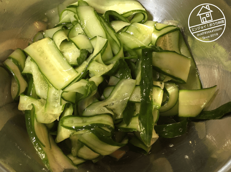 胡瓜を使って一品を作ります。縦にスライスして塩もみして、出た水分は捨てます。
