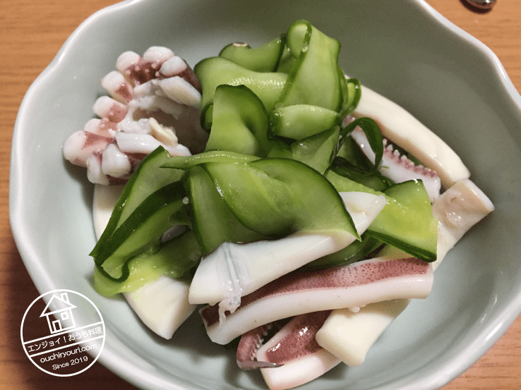 茹でたスルメイカと合わせて、寿司酢をかけたら胡瓜と烏賊の酢の物のできあがりです。さっぱりしていて美味しいです。