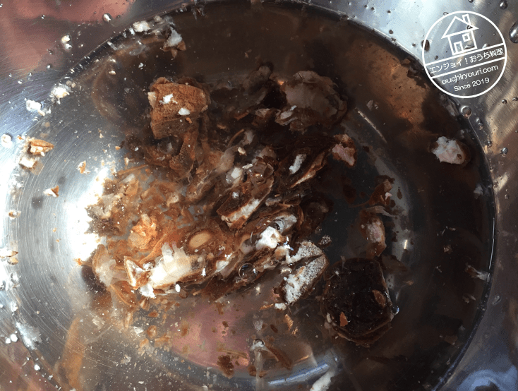 乾燥タマリンドを水で戻します。かけらをちょっと味見してみたら酸っぱくて美味しかったです。乾燥梅みたいな味でした。マメなのに不思議ですね。確かにスイーツにも使えそうです。