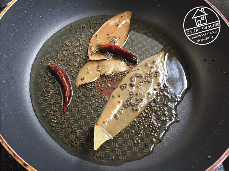 最後にテンパリングしたスパイス油を加え、香りを強化します。マスタードシード、唐辛子、インディアンベイリーフをサラダ油でテンパリングしました。