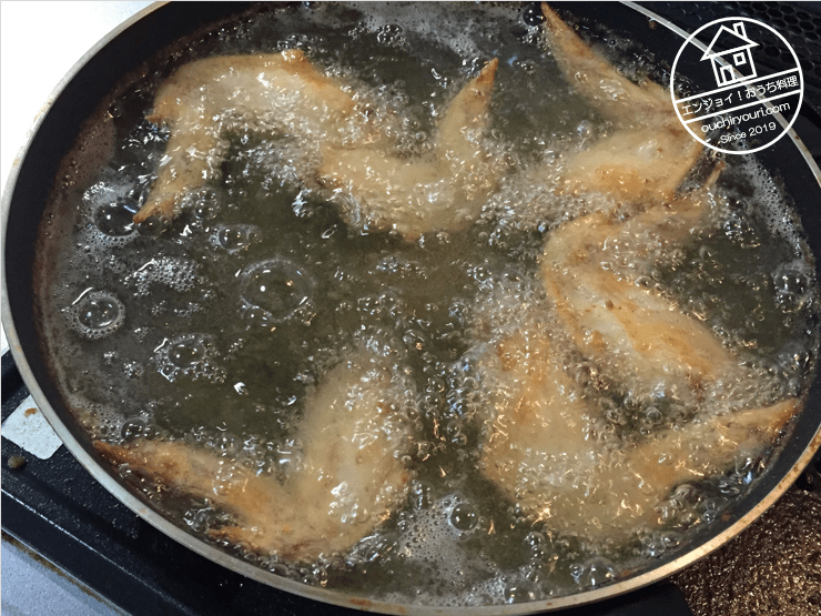 時々位置を変えたり裏返したりしながらひたすら中火で加熱します。水分が飛ぶと油の温度が上がり、良い色がついてきます。何も難しいことはありません。今回は170℃に達した時点で揚げは終了としました。