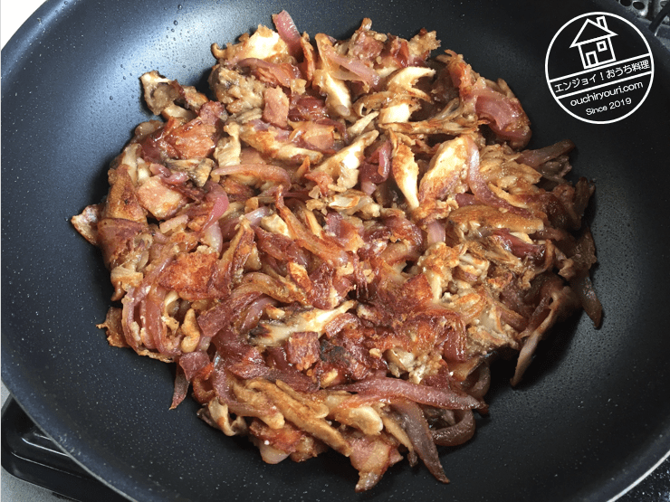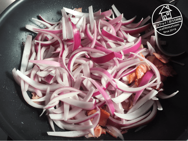 ベーコンに良い焼き色がついたら玉ねぎを投入して炒めます。
