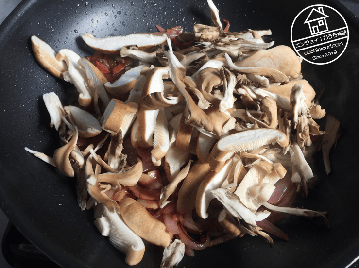 玉ねぎが良い飴色になったらキノコを投入します。今回は椎茸と舞茸です。キノコは長時間炒めると香りが飛んでしまうので、しんなりしたら次工程に進みます。