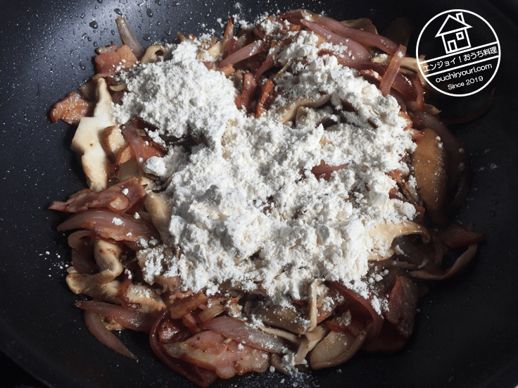 小麦粉を投入して炒めます。小麦粉に火を通すという意味です。